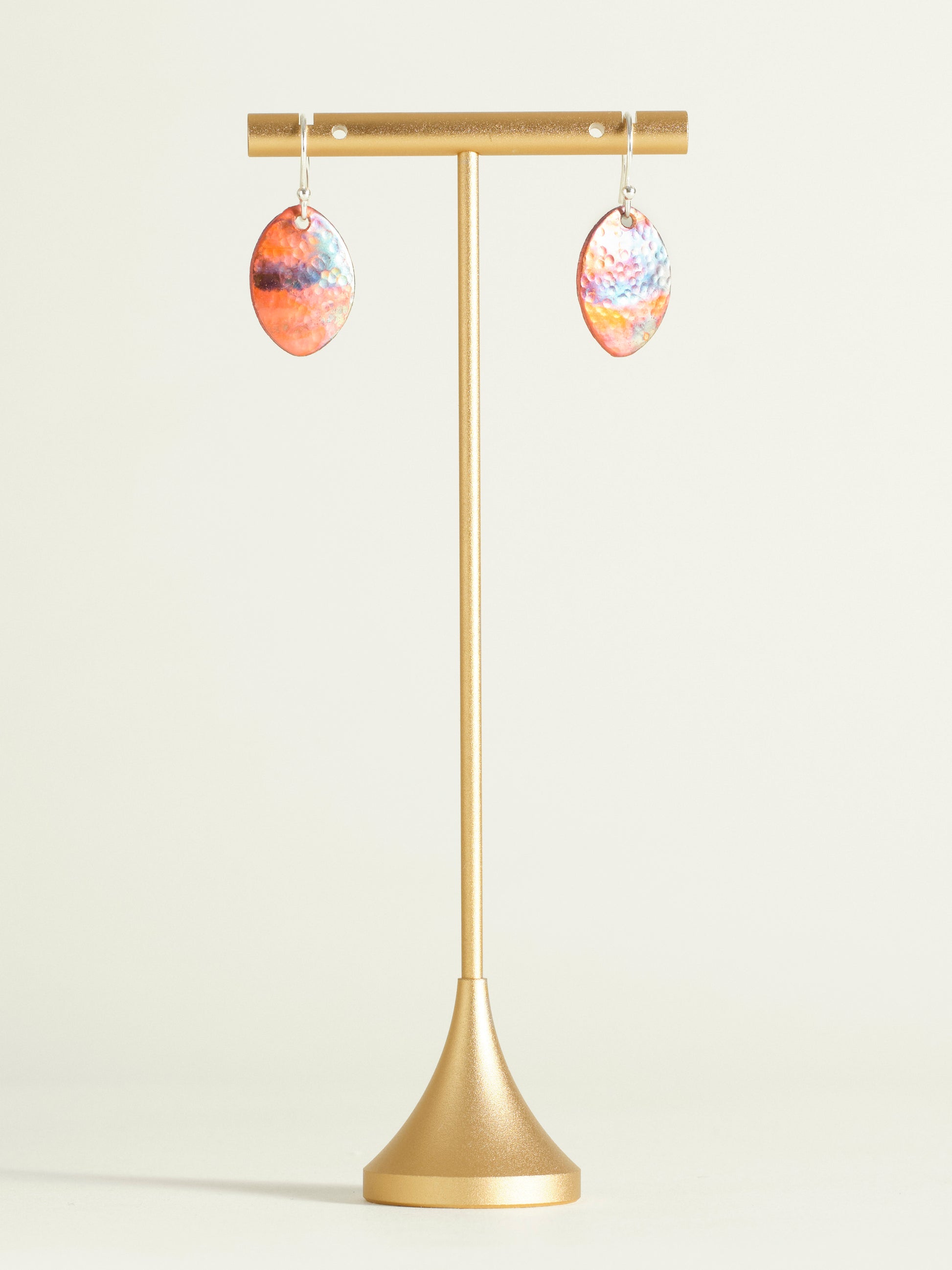 Earrings by Maureen Mc Ghee handcrafted with heat-treated copper, featuring colours from gold and blue to purple and red, and a hammered finish for added shine.