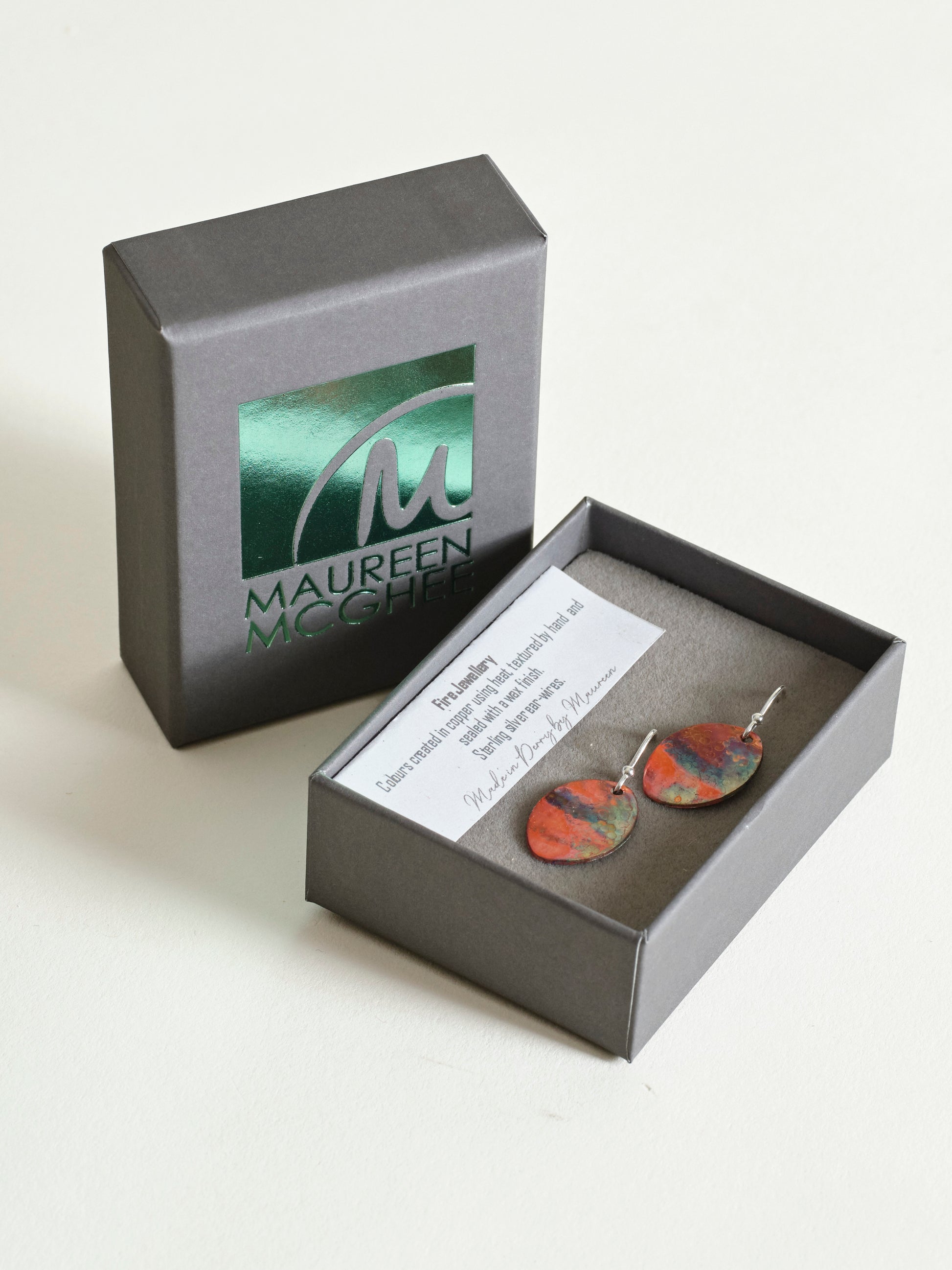 The copper earrings have a crystalline wax finish; polish occasionally with a soft cloth to maintain their lustre.