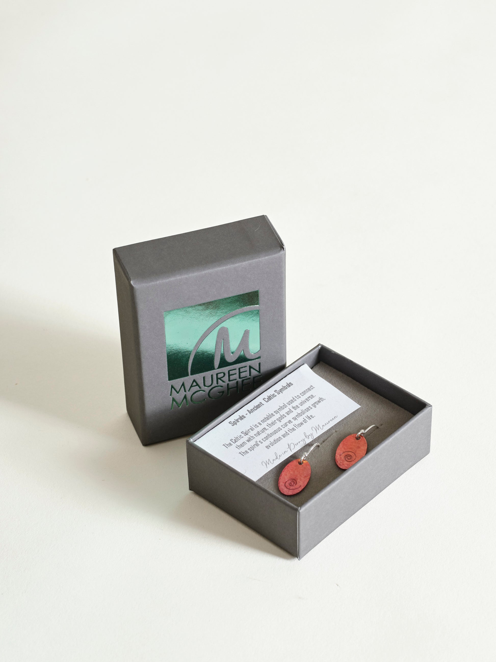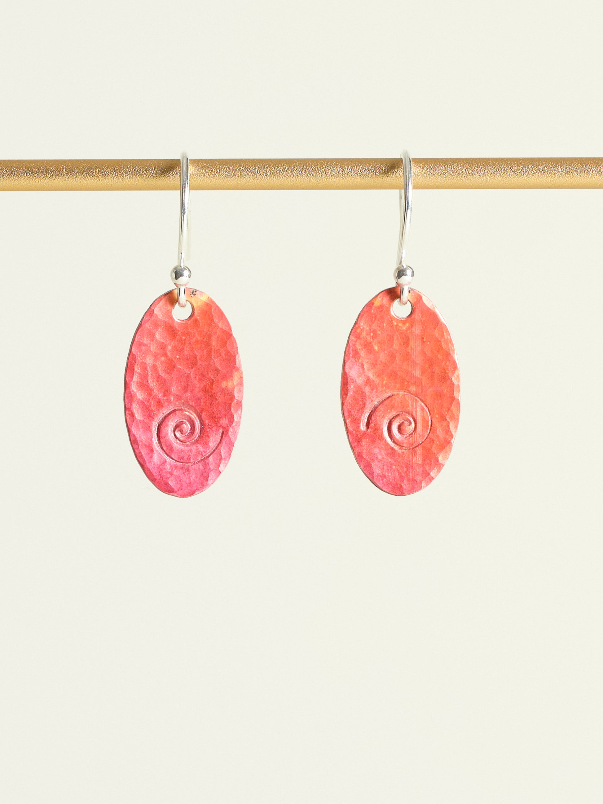 Handcrafted by Maureen Mc Ghee, these oval copper earrings feature a hand-stamped Celtic spiral motif and a hammered finish. Recycled sterling silver and eco-friendly packaging are used.