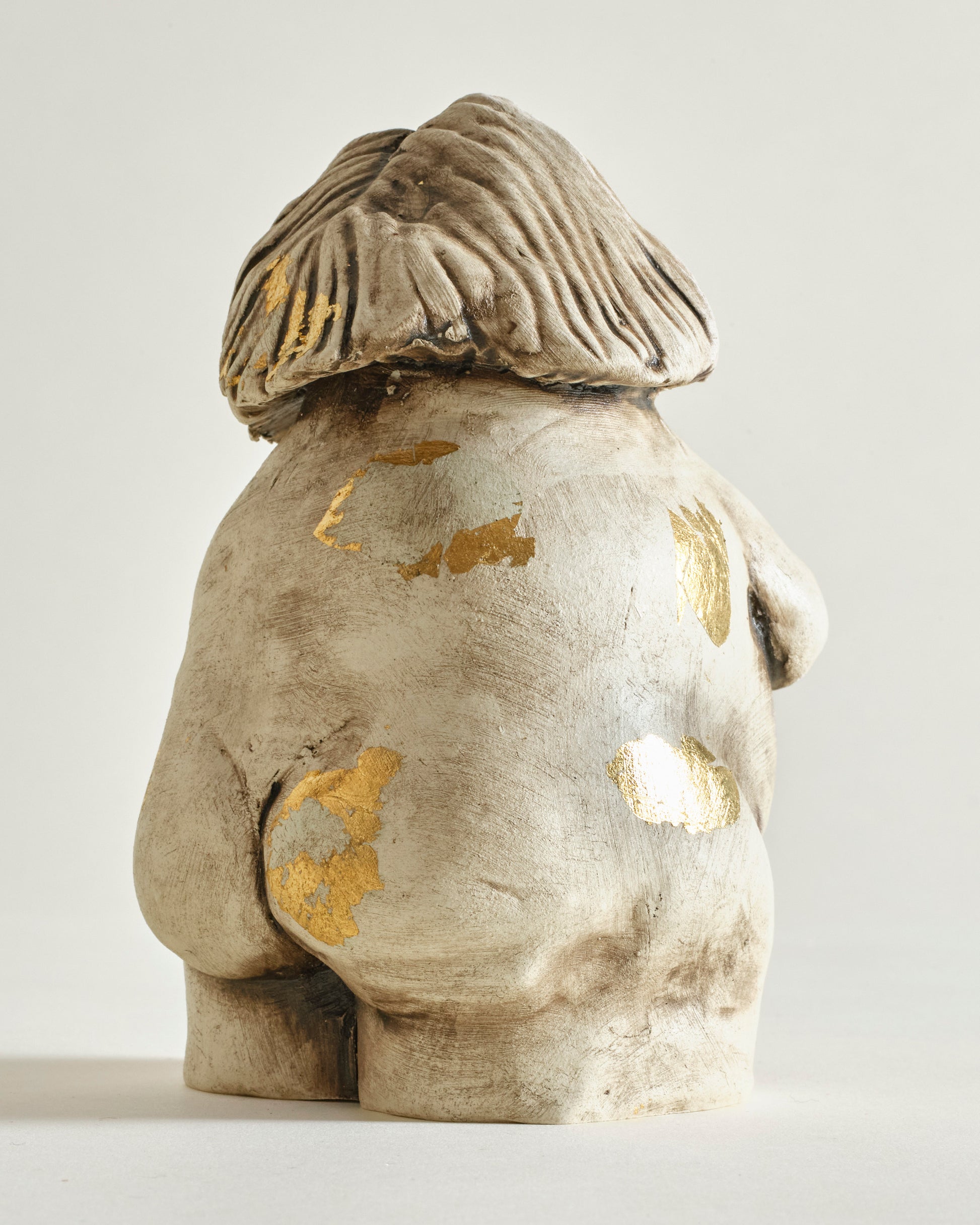 Ceramic stoneware figure, wheel thrown, altered and sculpted, depicting the goddess in us all, imperfect worn but still here. Finished in an oxide wash and gold leaf. Stands 14cm - 16 cm tall