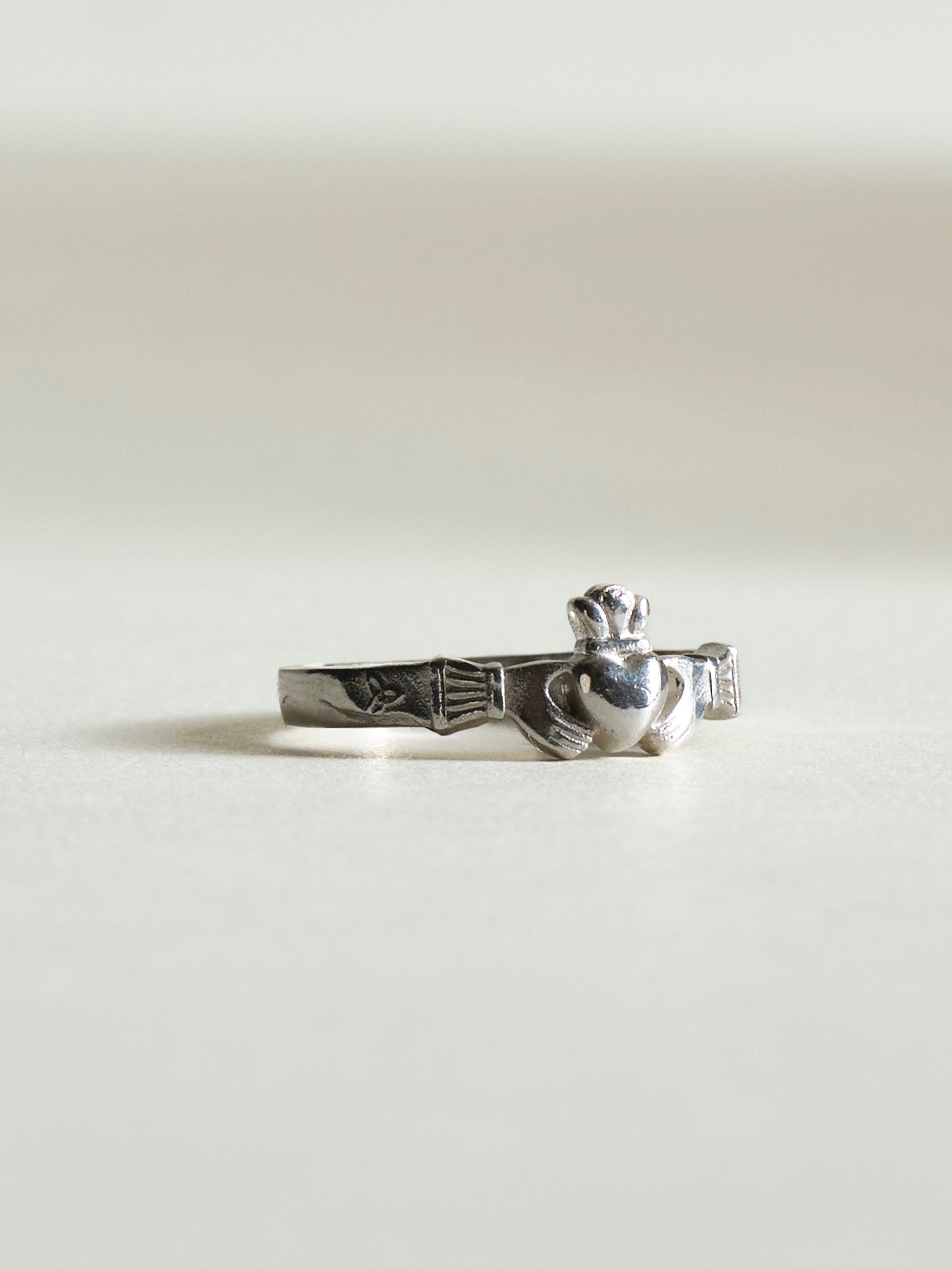 This delicate sterling silver Claddagh ring features the classic heart, hands, and crown symbolising love, loyalty, and friendship. Its dainty design suits everyday wear or gifting, with traditional meanings depending on how it is worn.