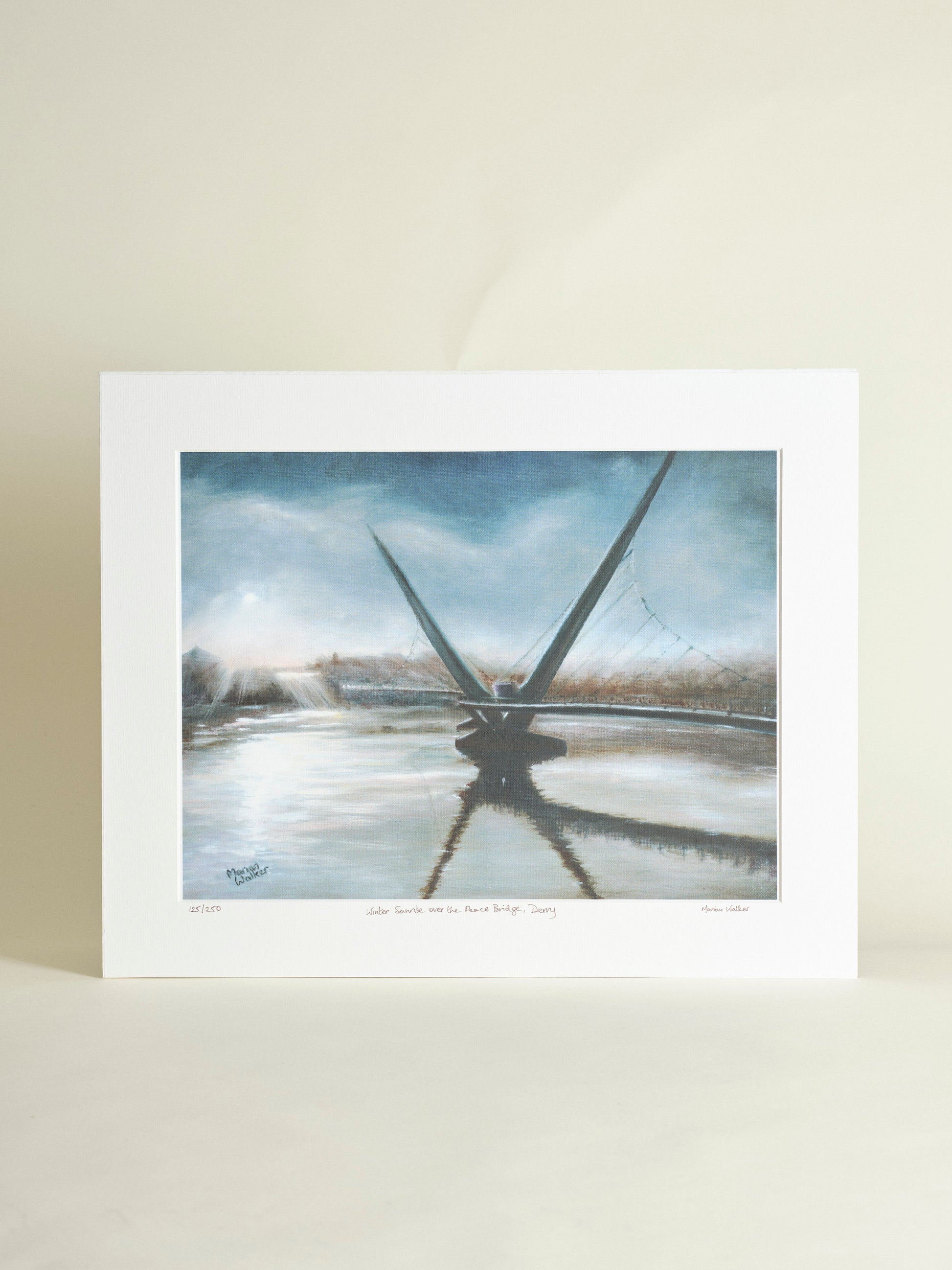 This evocative image conjures up the early morning feeling of a calm, misty winter morning, Her work has found homes the world over for those who have visited, or for those of us who have left our beautiful shores. the iconic Peace Bridge dark against the rising sun as it breaks through the mist highlighting reflections and light dancing on the River Foyle.